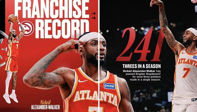 沃克本赛季命中244记三分,创造老鹰队史单赛季第一纪录。