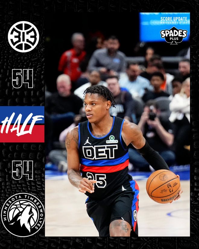 勒维尔三分命中,他率队以7-0的小高潮开始第二节,活塞队重夺领先。里德回应三分,香农连进两球,森林狼队很快夺回领先。两队之后各得几分,康利外线手感来了,连进两记三分,戈贝尔两罚一中,半场前4分10秒时他们以52-45领先。詹金斯和杜伦一同发力率队以9-2的反击波结束第二节,双方以54平握手言和进入半场休息。