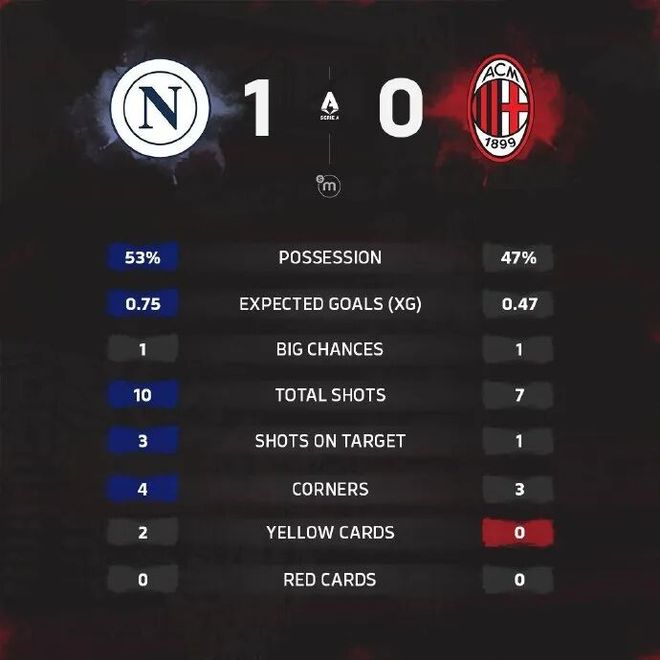 第79分钟,那不勒斯左路进攻,阿利松·桑托斯盘带分球,奥利维拉跟进下底传中,门前阿特卡梅解围没顶远,后点波利塔诺跟进小角度破门,米兰0-1落后
